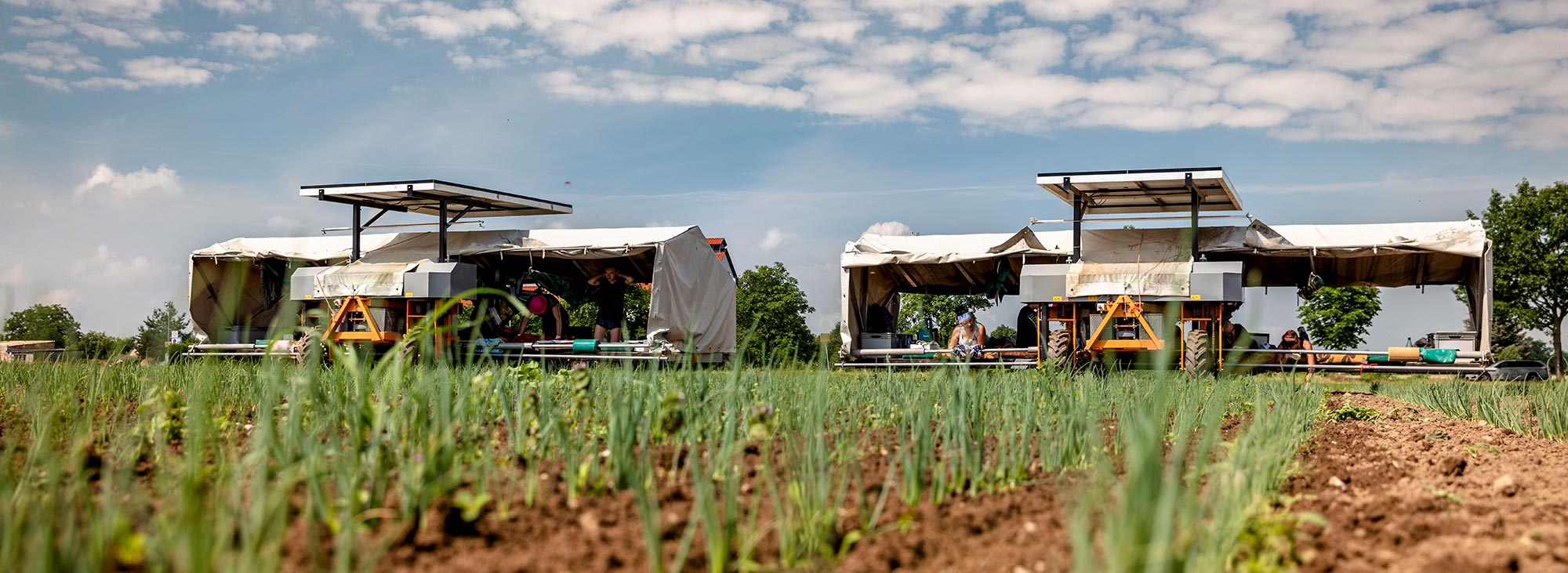 Weil auf die Äcker keine Zusätze kommen, wird zwischen den Zwiebelreihen maschinell gehackt und die Pflege in den Reihen erfolgt vom Jäteflieger aus per Hand. Dazu sind Erntehelfer auf sogenannten „Jätefliegern“ im Einsatz und entfernen das Unkraut. Diese Arbeit ist anstrengend und erfordert Geschick, denn Unkraut und Zwiebelpflänzchen dürfen nicht verwechselt werden.